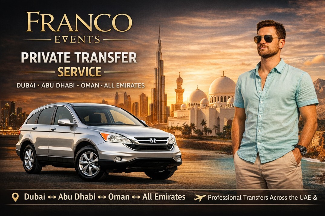 Franco Events offers professional private transfer services across Dubai, the UAE, and Oman, providing reliable and comfortable transportation for airport transfers, intercity travel, and cross-border journeys. Whether you are traveling within the UAE or planning a trip to Oman, our service ensures a smooth, safe, and stress-free experience.